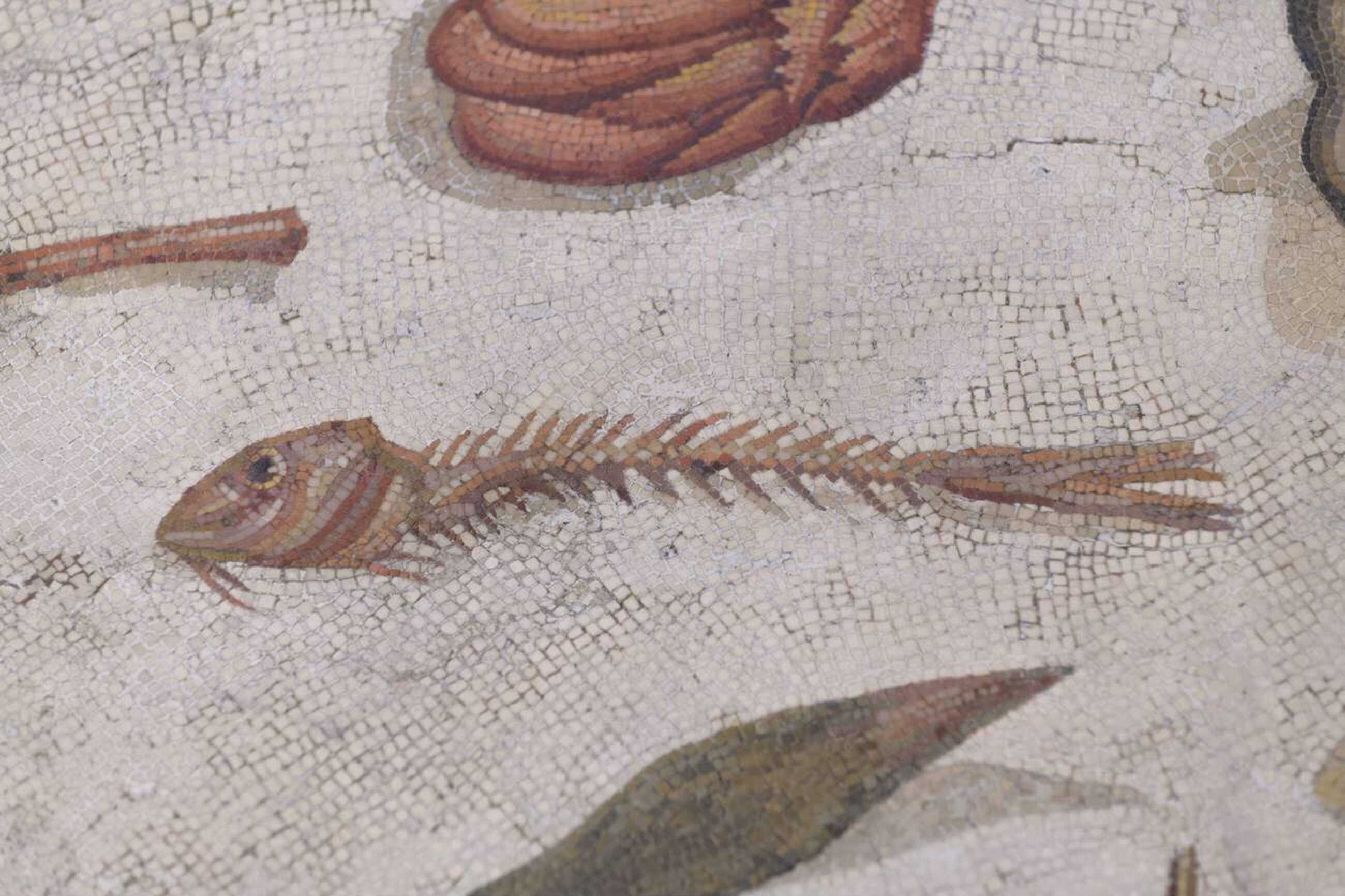 Detail with a fishbone from a red mullet from the asarotos oikos mosaic. Credits: