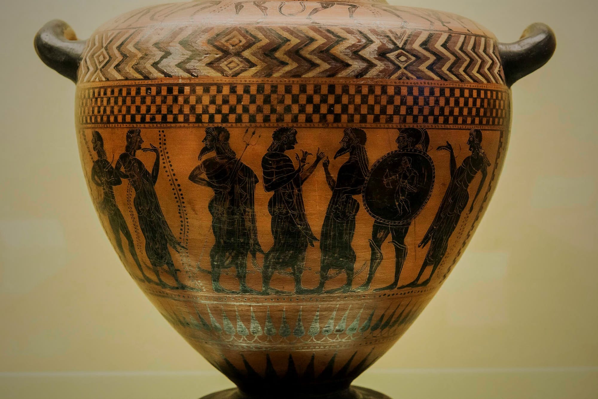 An Ancient Etruscan Amphorae depicting Heracles’ Apotheosis, by Micali. Heracles on the far left holding his club, next to him possibly Athena. Poseidon, Hera and Zeus in the middle, Ares and Aphrodite on the right. Credits: Egisto Sani, CC BY-NC-SA 2.0