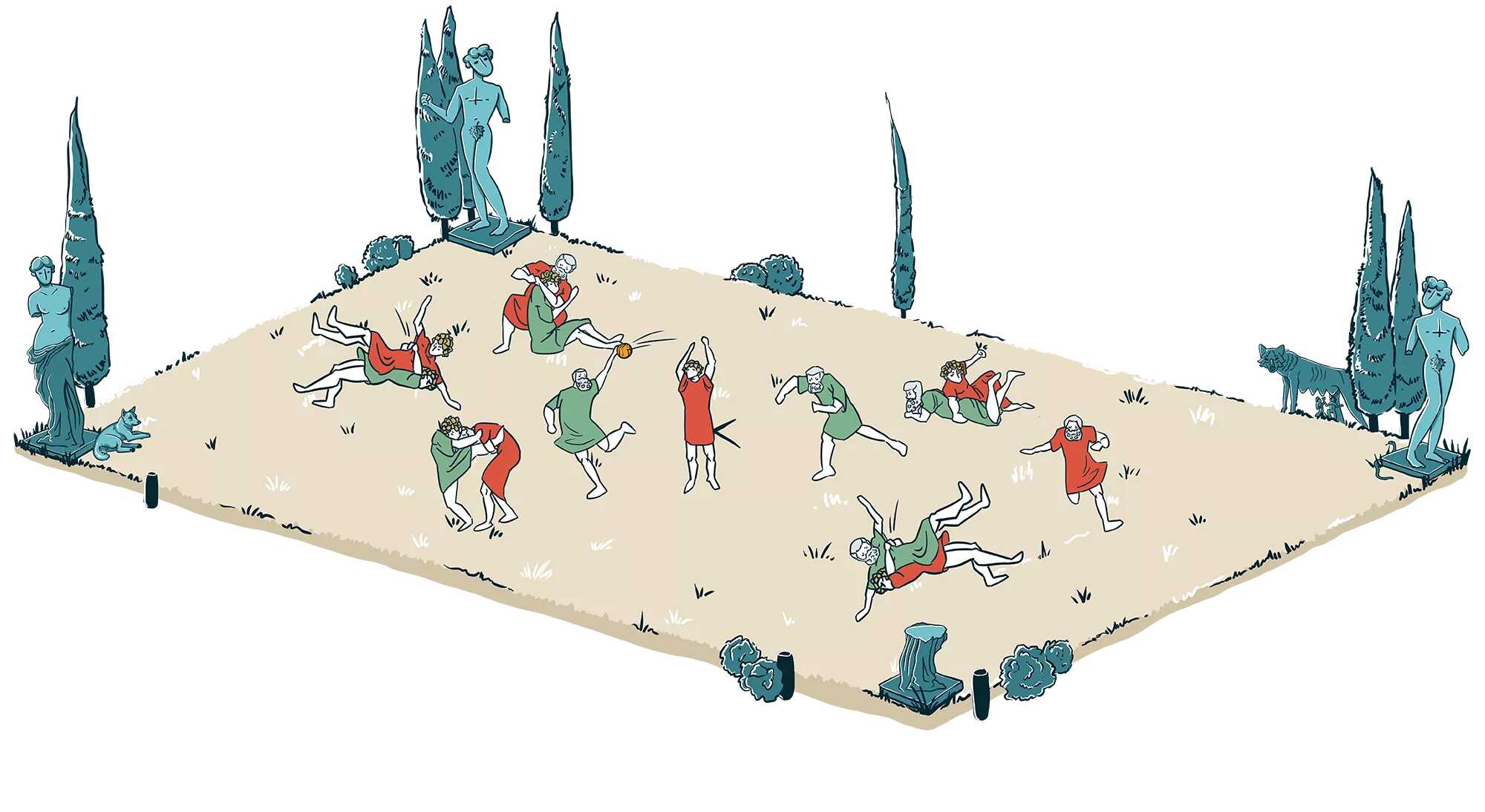 Image #1, The Pitch: No historical accounts provide specifics about the pitch’s size, layout, or location. It remains ambiguous how the playing field for Harpastum was structured.