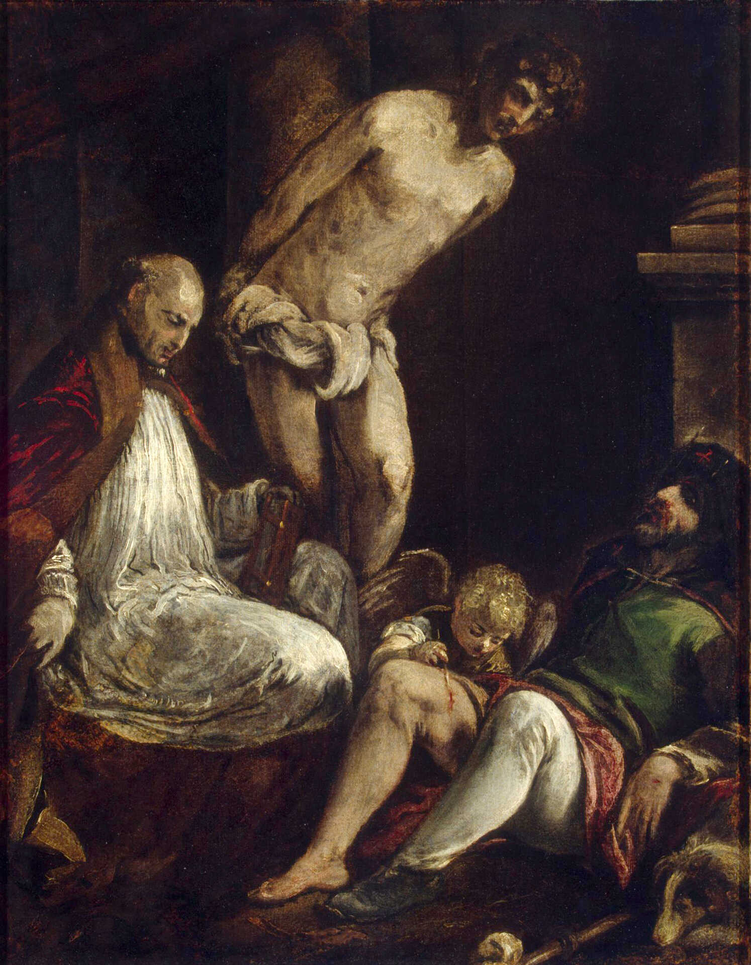 Image #2: A painting showing Saint Fabian, Saint Sebastian and Saint Roch, the two first famously persecuted and martyred under Emperor Decius and Emperor Diocletian.
