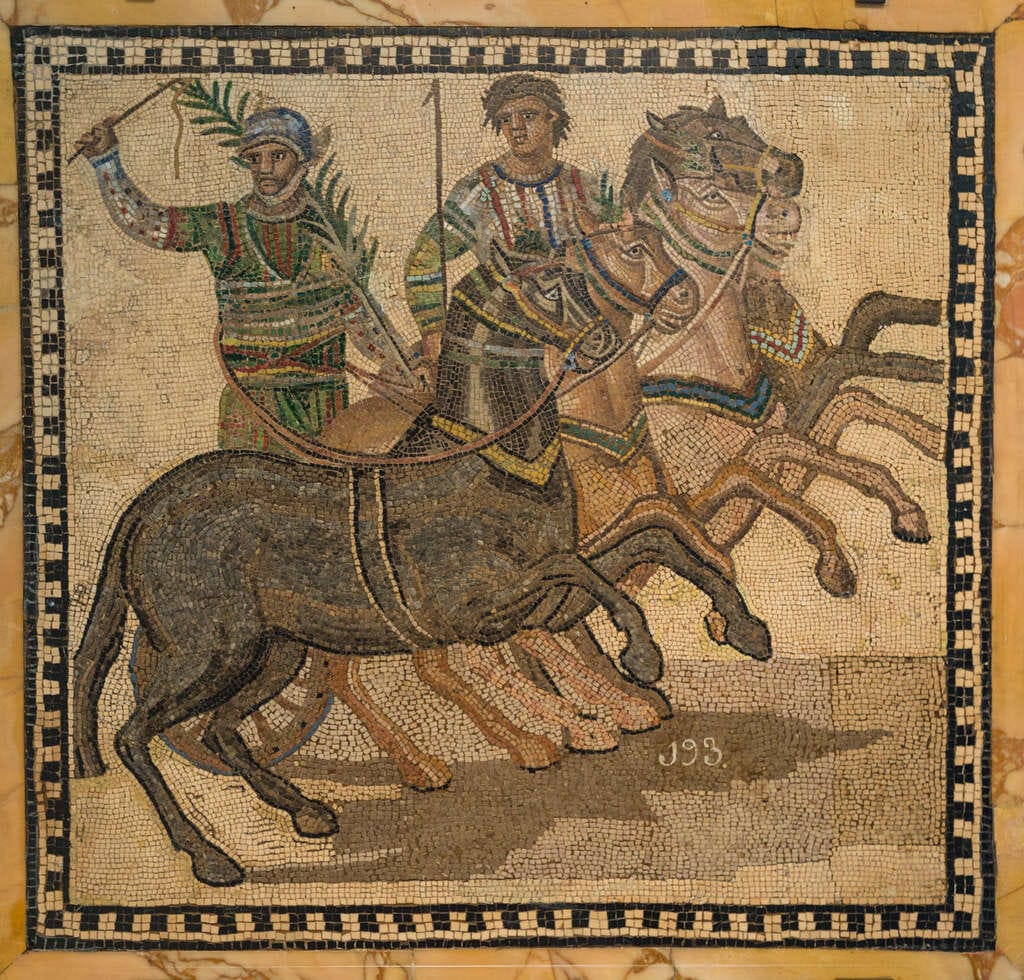 Charioteers of the Red, Green, Blue and White team; part of a mosaic of the third century AD, exhibited in the Museo Nazionale Romano.
