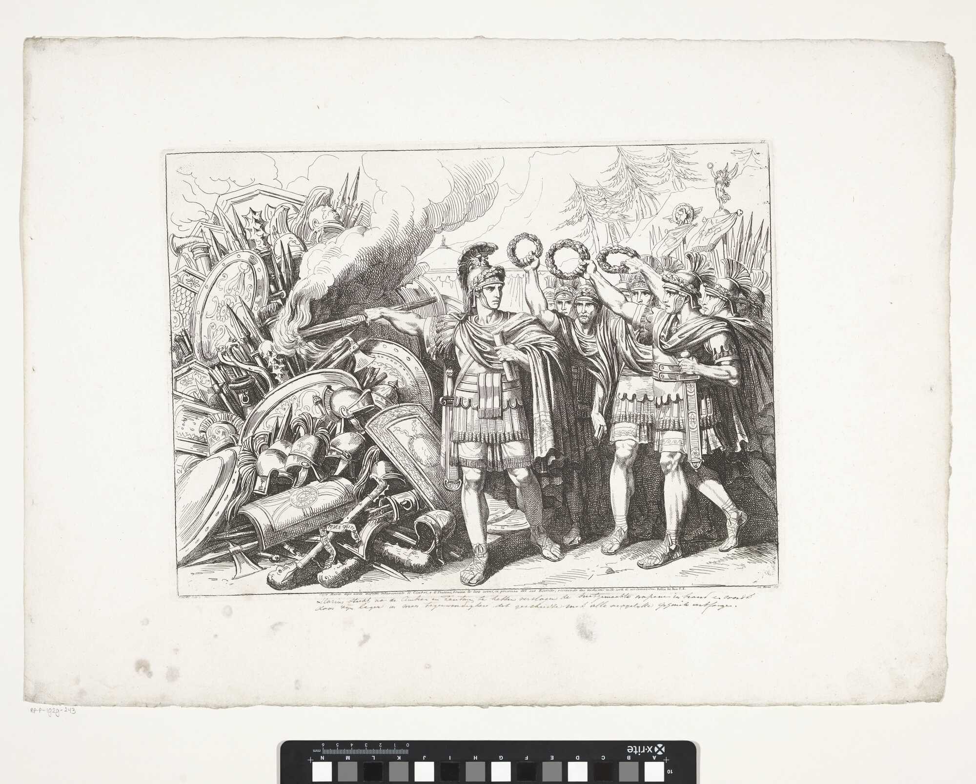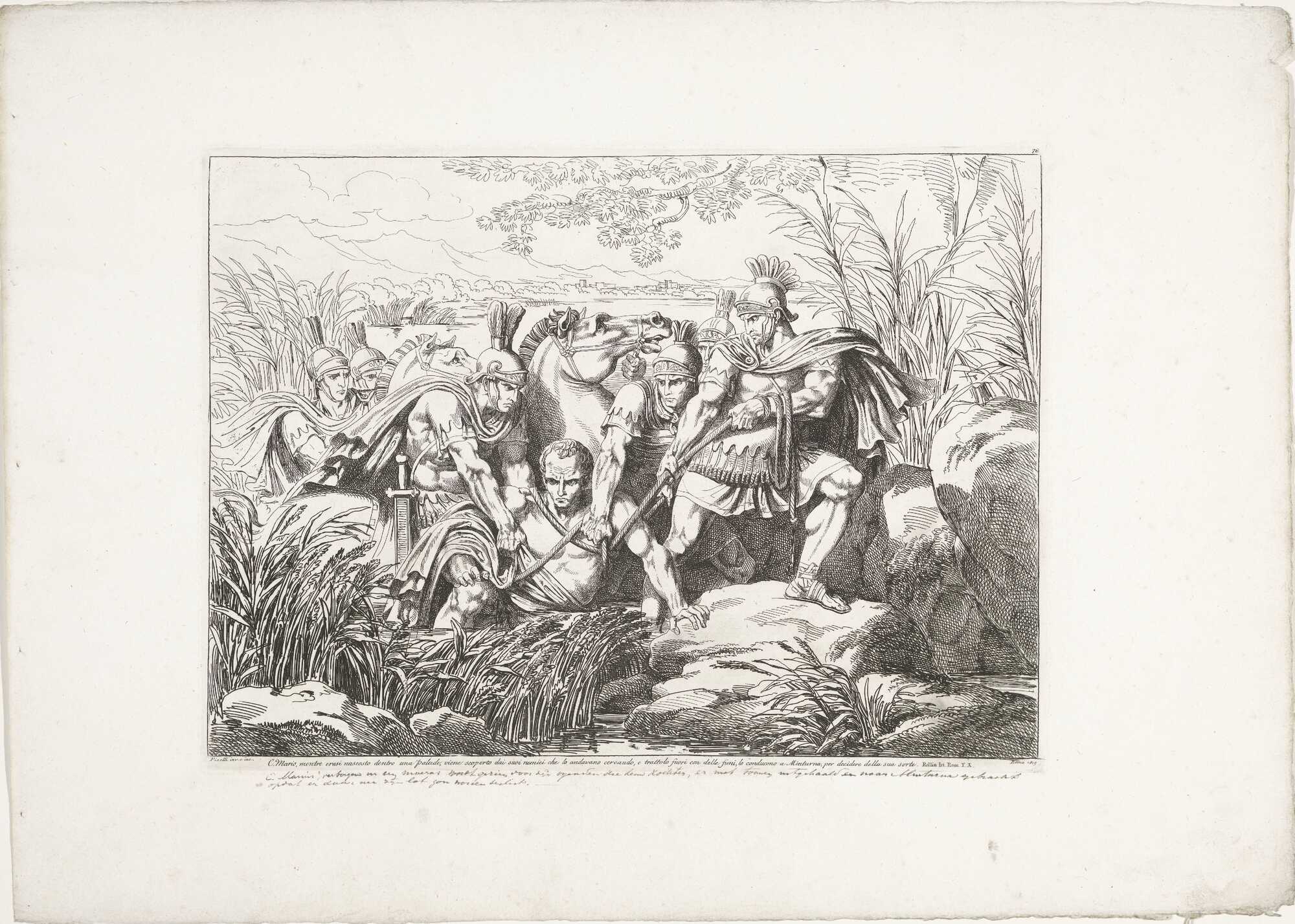 Image #1: Caius Marius after having completely defeated the Cimbri and the Teutons, burns their weapons, in the presence of his Army, receiving from the same thousand lots of acclamations. Image #2: Caius Marius, while he was hiding inside a swamp is discovered by his enemies who were looking for him, and take him out with ropes in order to lead him to Minturna, to decide his fate. Public domain