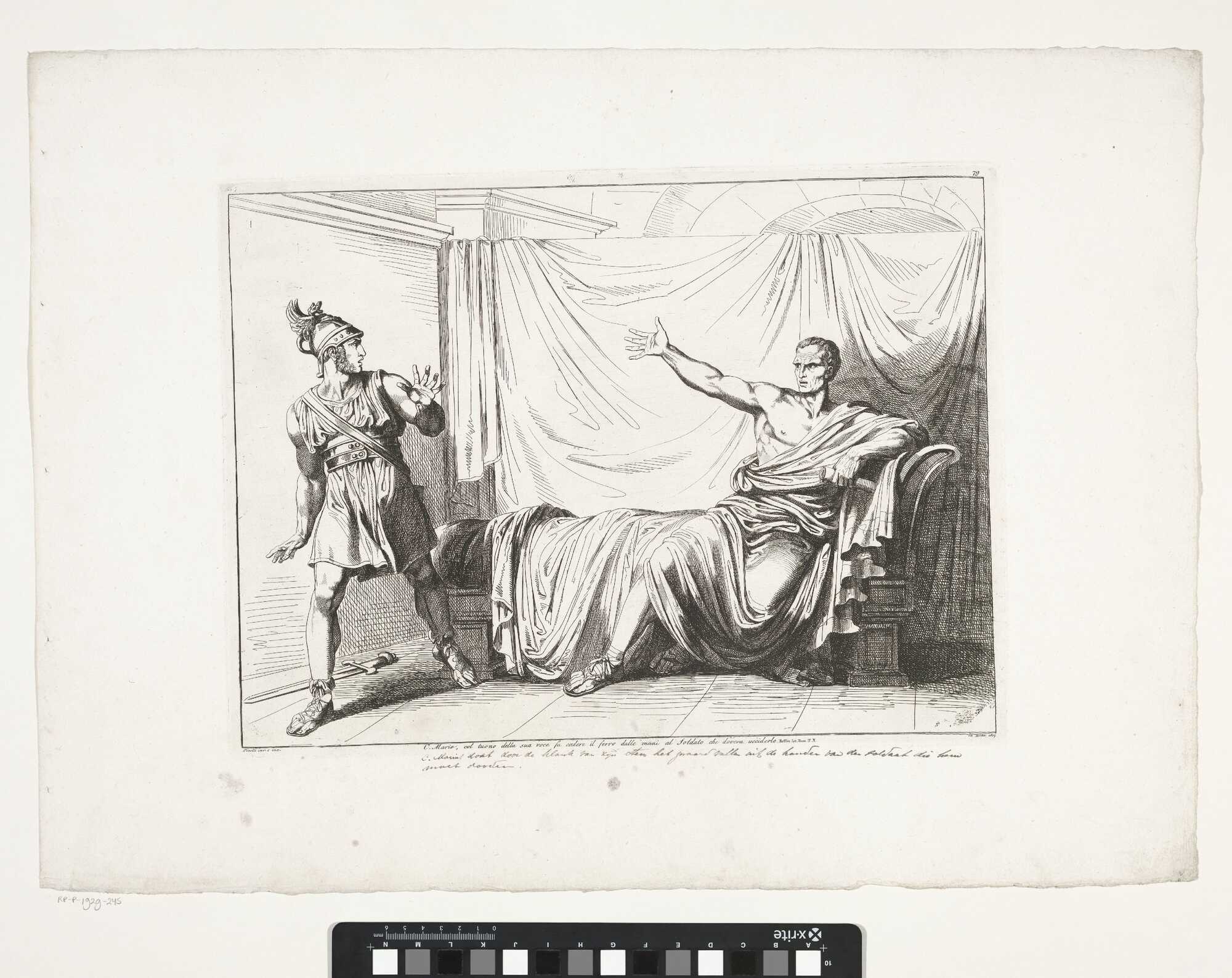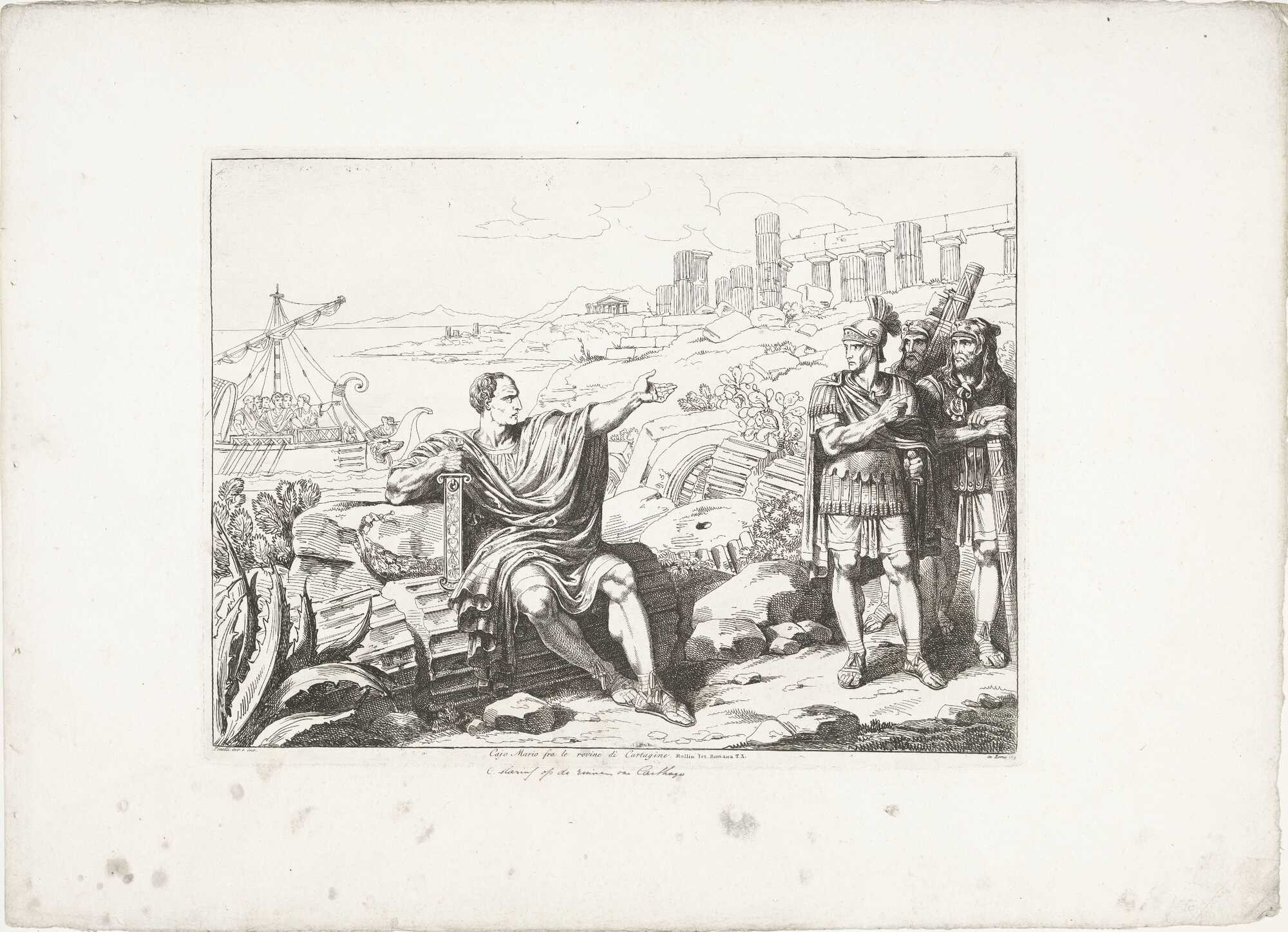 Image #1: Gaius Marius sits on the ruins of Carthage. Image #2: Caius Marius, with the thunder of his voice, drops the sword from the hands of the soldier who was sent to kill him. Public domain
