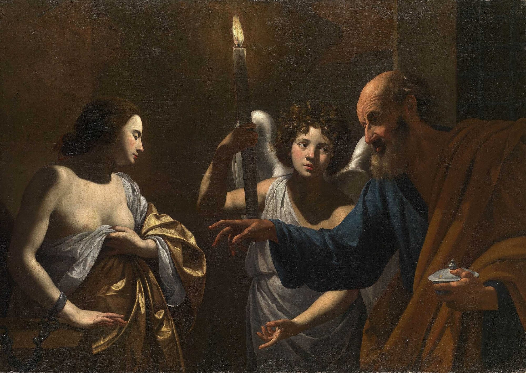 A painting by Simon Vouet, of Saint Peter visiting Saint Agatha in Prison. Public domain