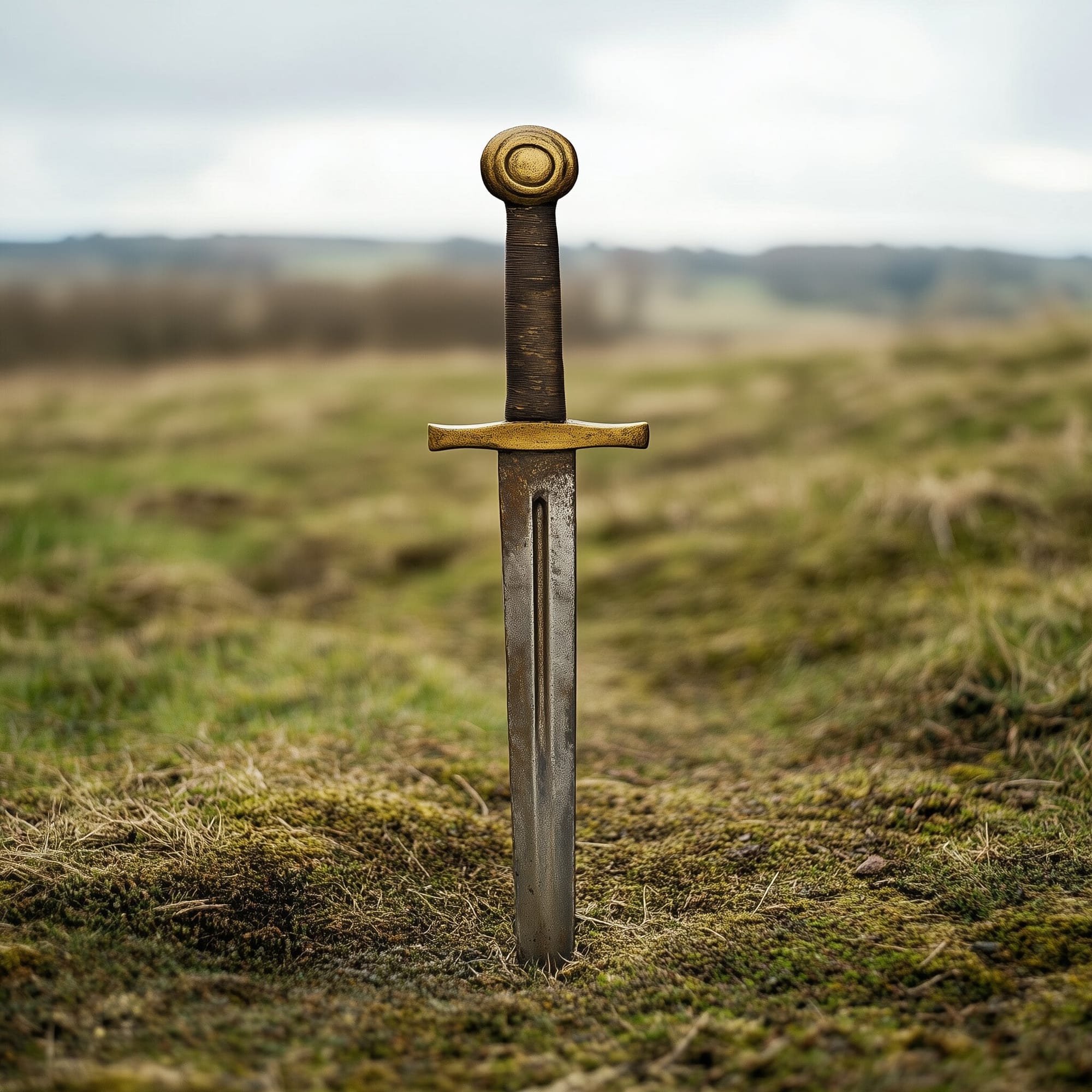 A representation of a Roman sword, pinned on the British countryside ground. Illustration: Midjourney