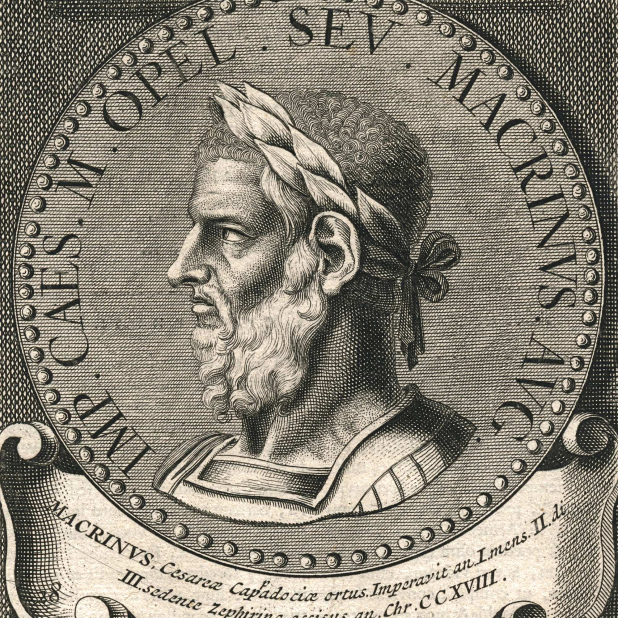 A gravure of a medallion depicting Roman emperor Macrinus. Public domain