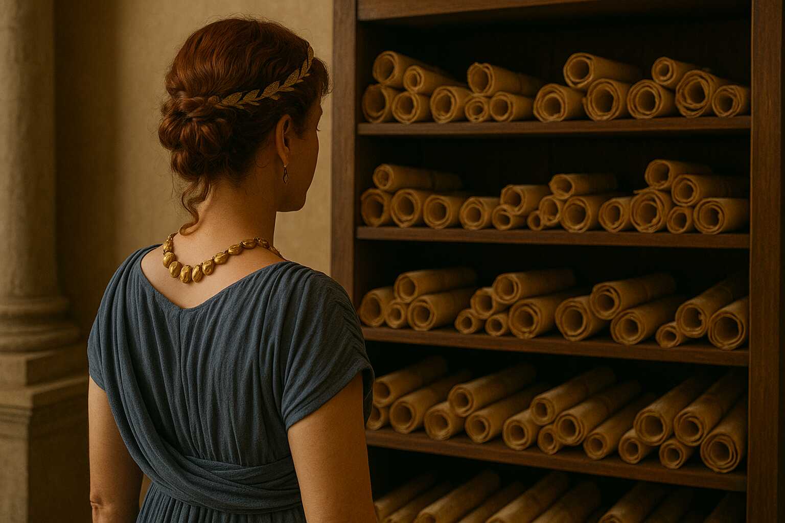 A possible representation of Servilia, browsing her villa’s wealthy library. Credits: Roman Empire Times, Sora