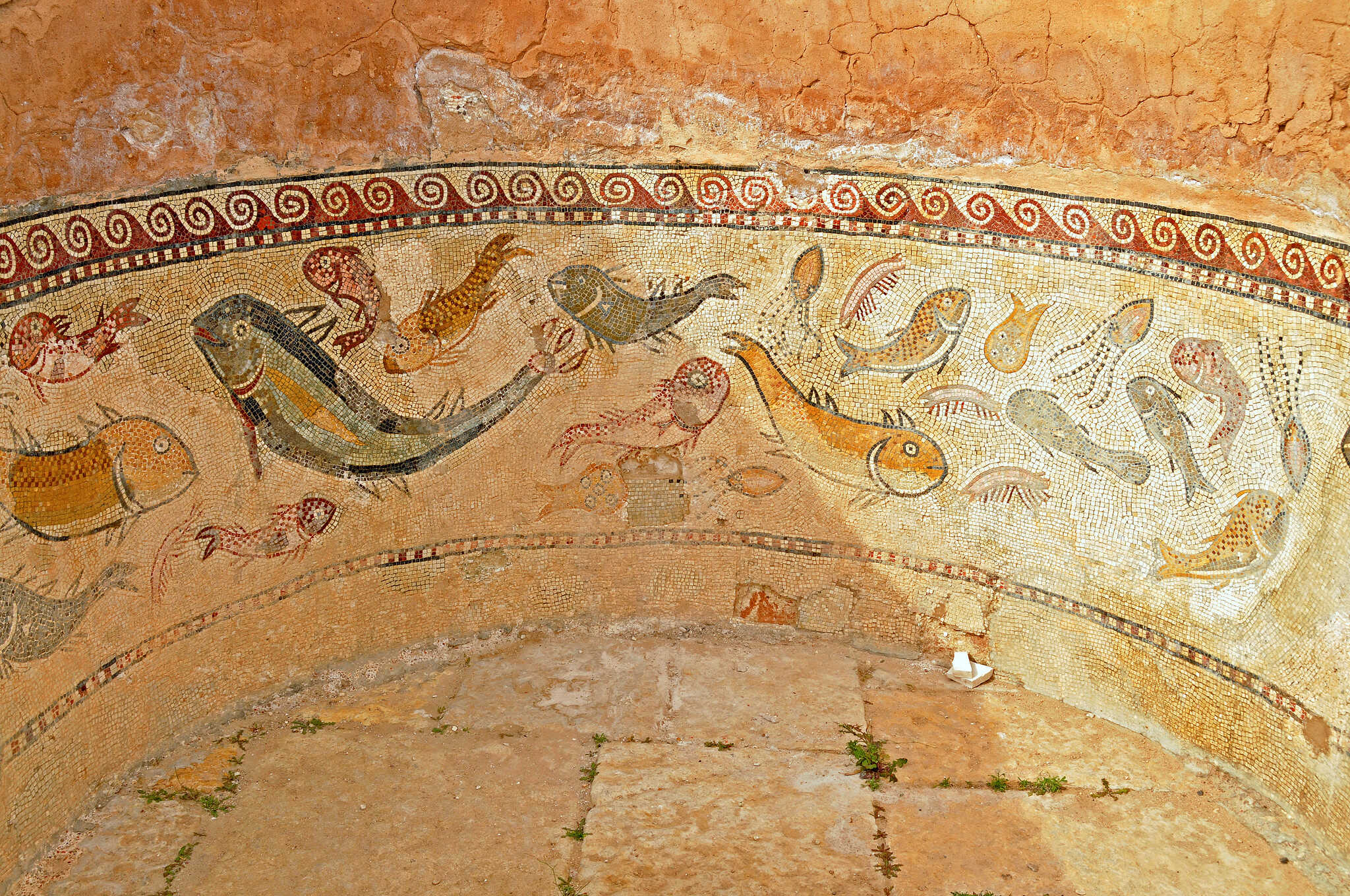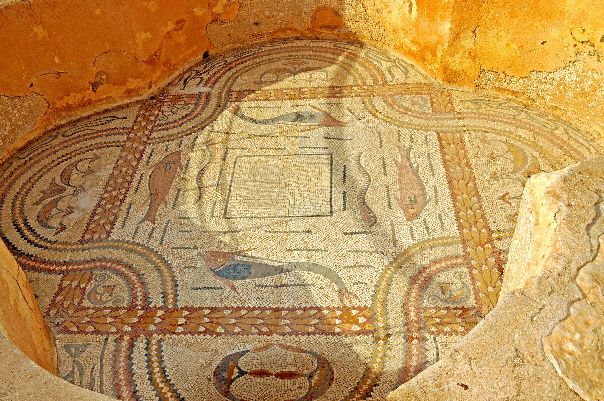 The Roman provinces of Africa left their mark in modern Tunisia. Detail from a Roman mosaic, a Roman bath, and the Temple of Minerva. Credits: Dennis Jarvis, CC BY-SA 2.0