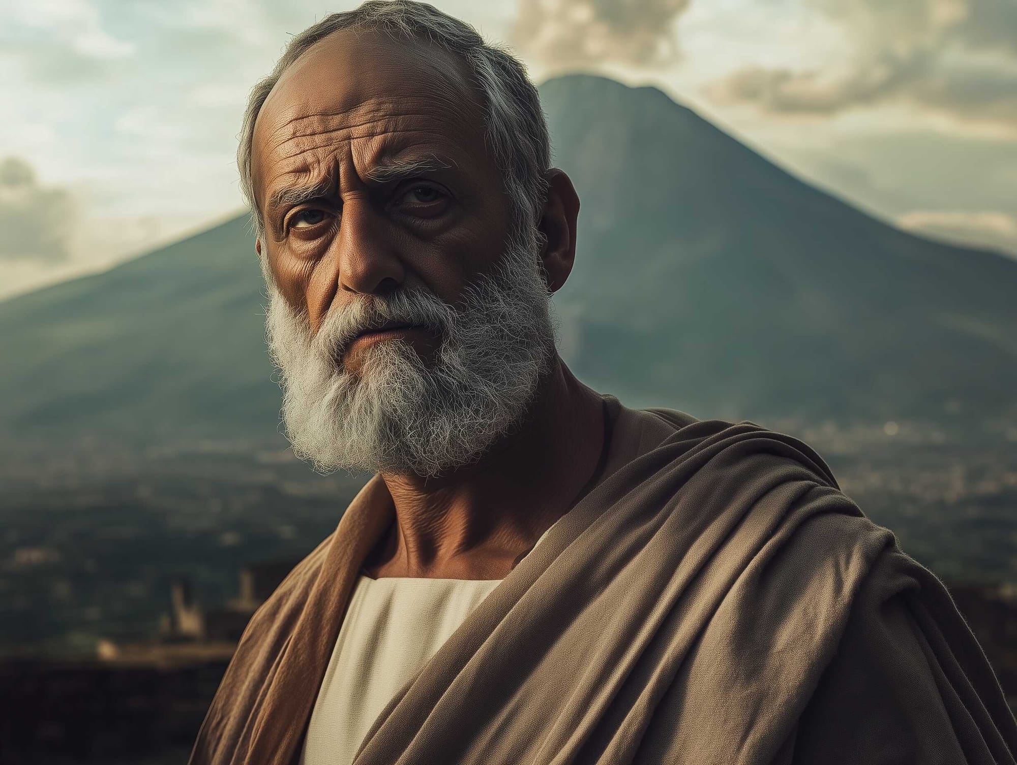 A possible representation of Pliny the Elder, with Mount Vesuvius in the background. Credits: Roman Empire Times, Midjourney