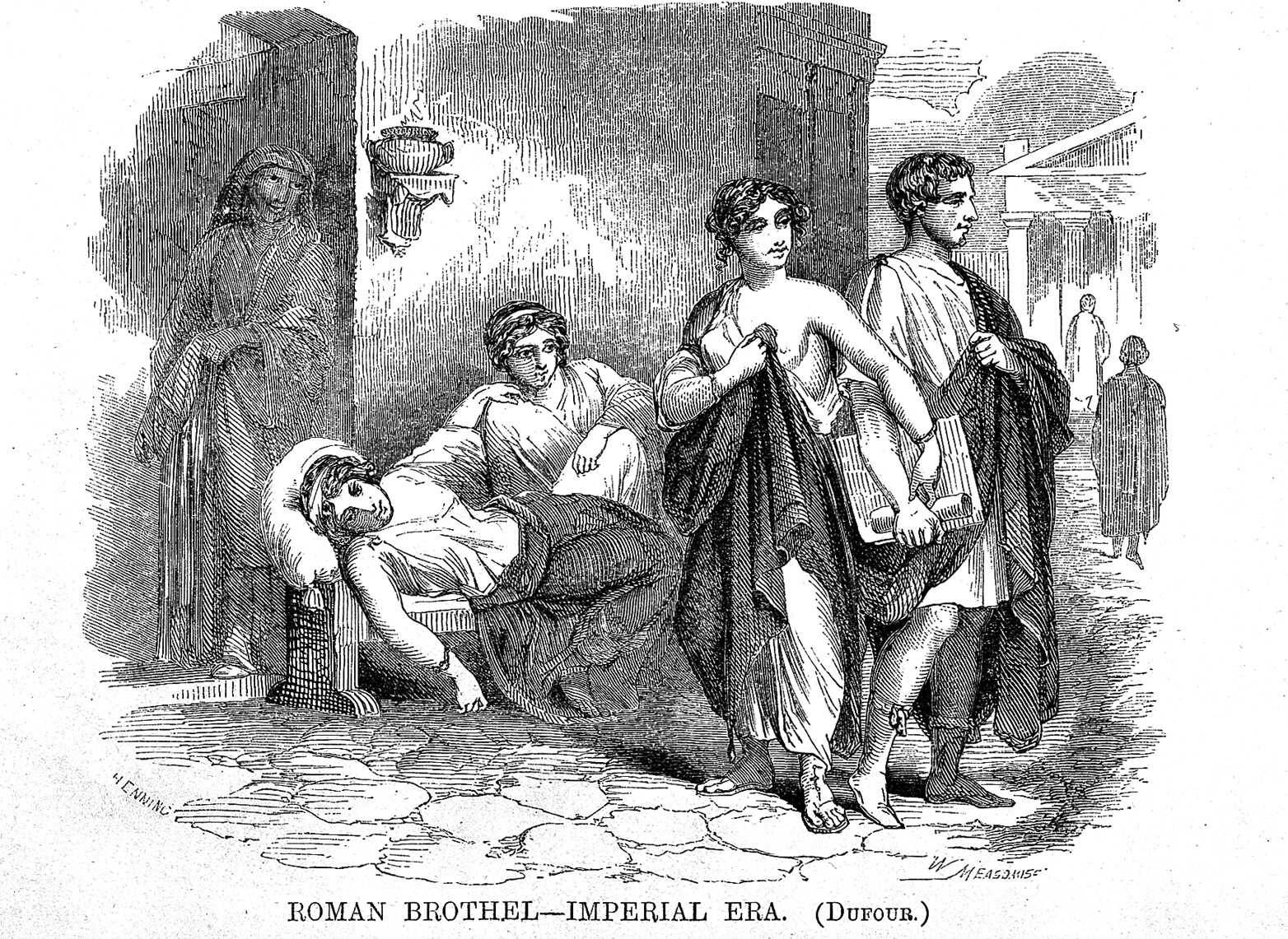 Some scholars argue that for many enslaved women, sex work was considered a form of domestic labor, especially when it took place within the household. Graffiti found near the entrances of private homes suggest that enslaved prostitutes may have received clients in their owners' residences.