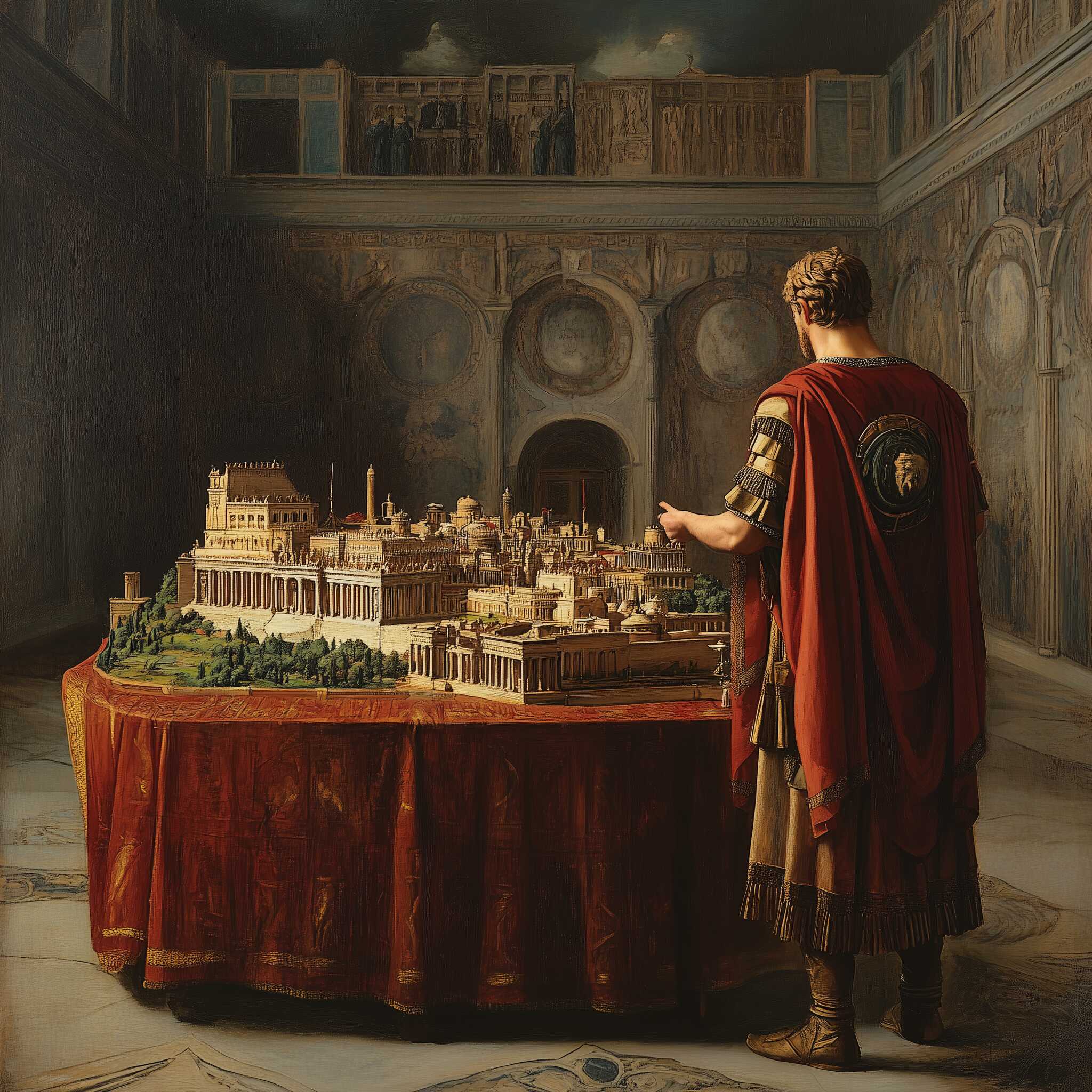 Emperor Constantine the Great, admiring a model city of Helenopolis. Illustration: Midjourney