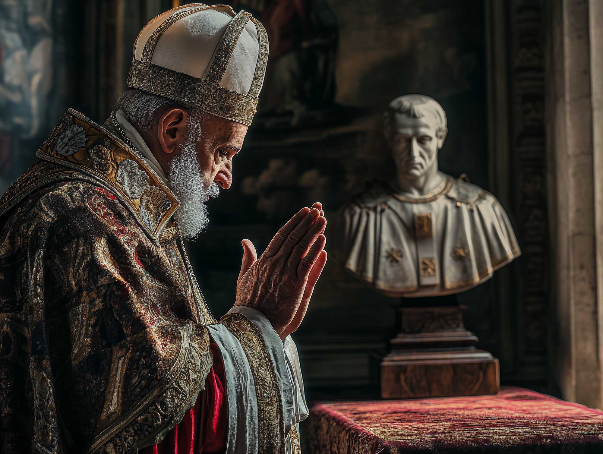 A possible representation of Pope Gregory the Great, praying for the salvation of Trajan’s soul. Illustration: Midjourney