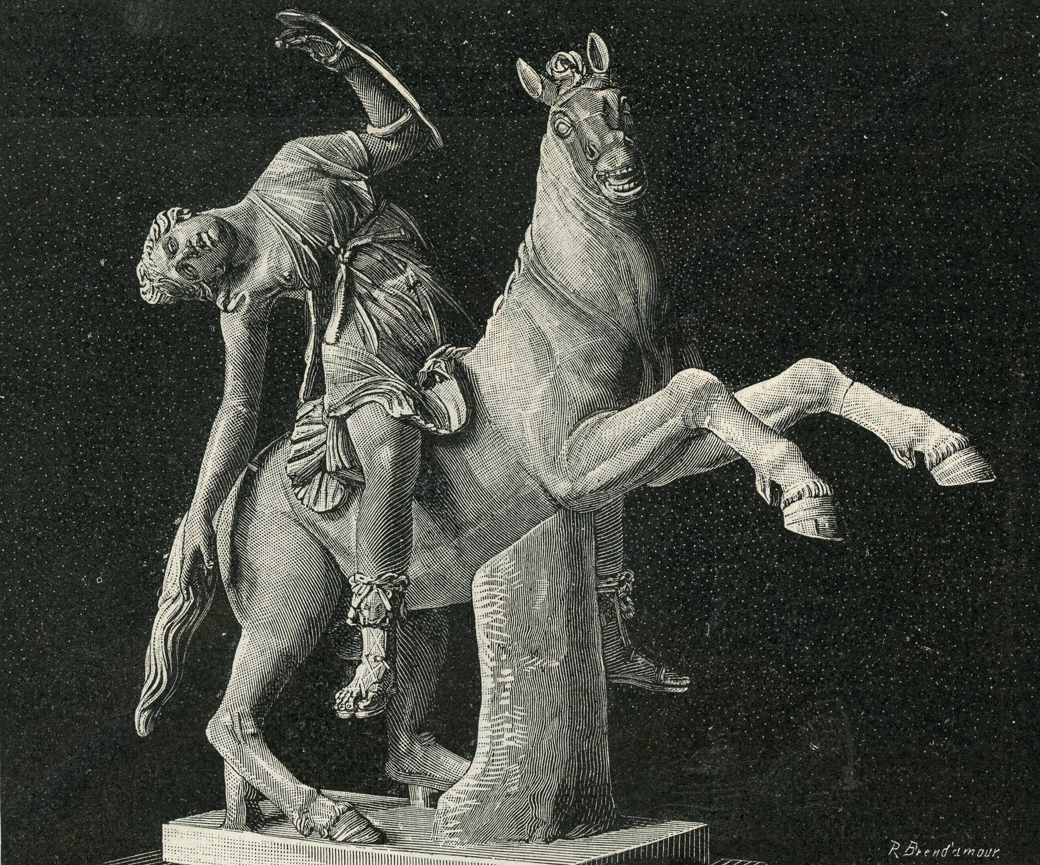 Dying Amazon on horseback, a hand woodcut (xylography) by Richard Brend'amour, based on the Roman copy of a Greek marble statue. Public domain