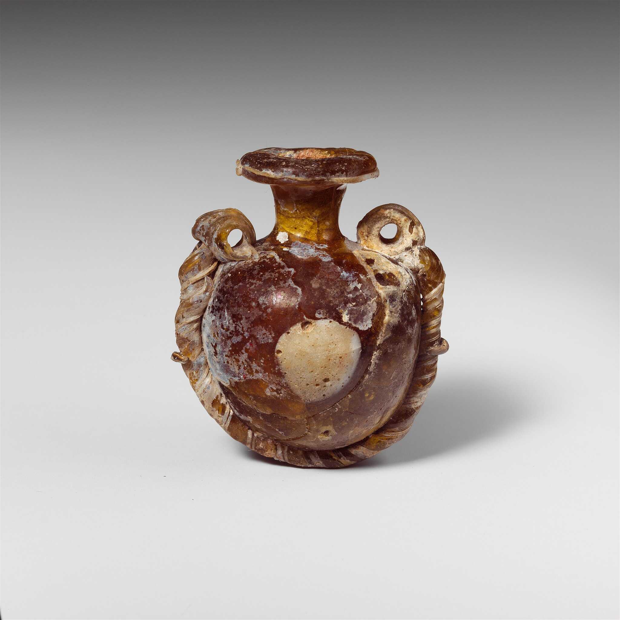 Image #1: East Greek terracotta perfume bottle (aryballos) in the form of a helmeted head. Images #2 & #3: Ancient Greek glass lentoid aryballos (perfume bottle). Credits: The MET, Public domain