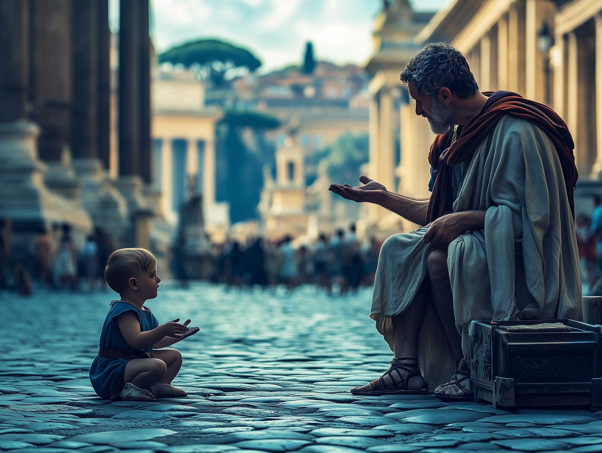 A possible representation of a Roman slave teaching his kid about the value of becoming a Roman citizen in his adult life. Illustration: Midjourney