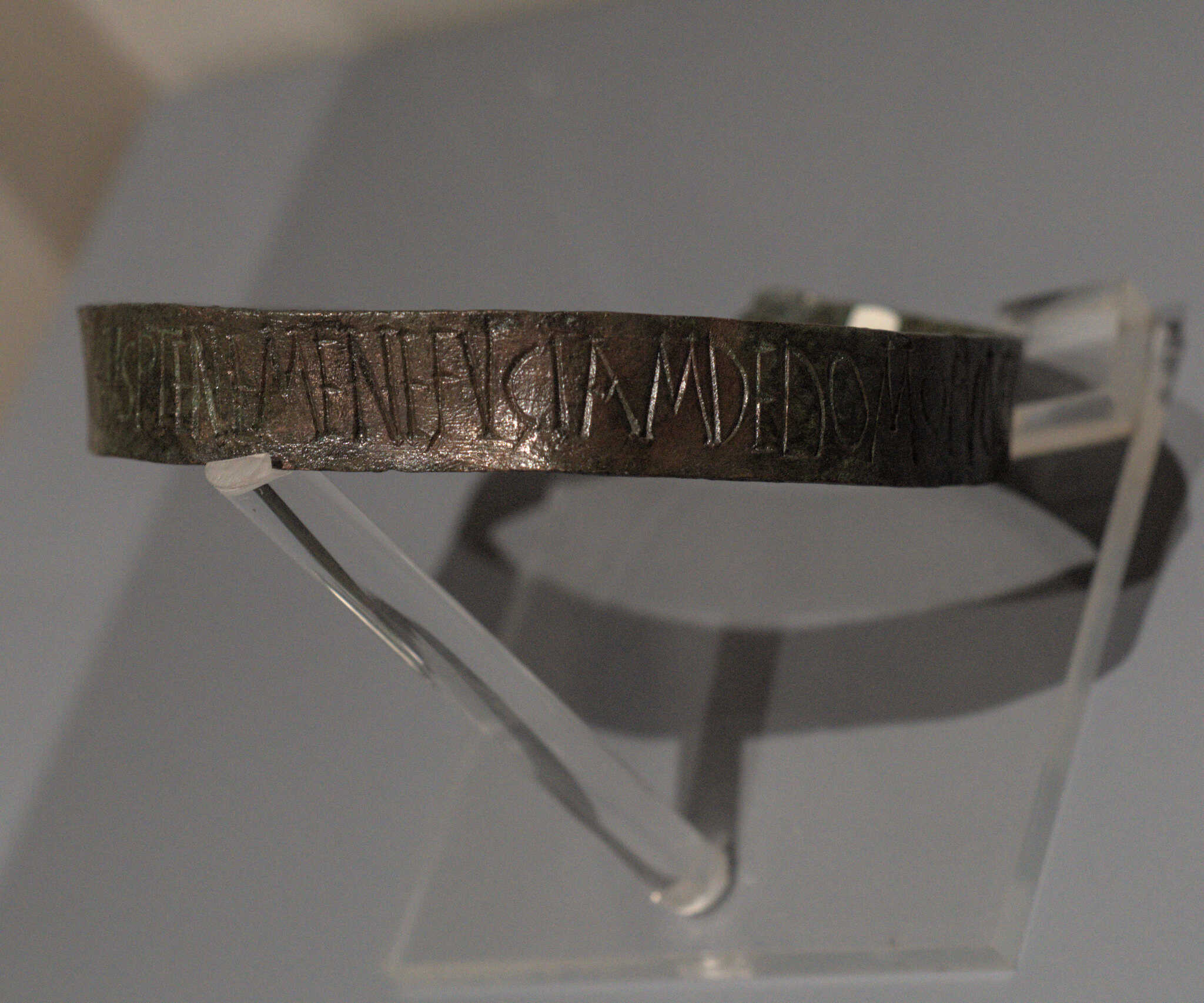 The Zoninus collar, for instance, is made of iron and bronze, materials as harsh and utilitarian as the inscription’s blunt message. The tag itself was cut from a bronze sheet into a rounded rectangle, with an extended strip at the top that folded back to form a hoop. This hoop was then riveted shut, creating a permanent attachment point. The iron neck ring, now heavily corroded, seems to have been formed by twisting doubled wire, which was then threaded through or enclosed by the hoop before being sealed.