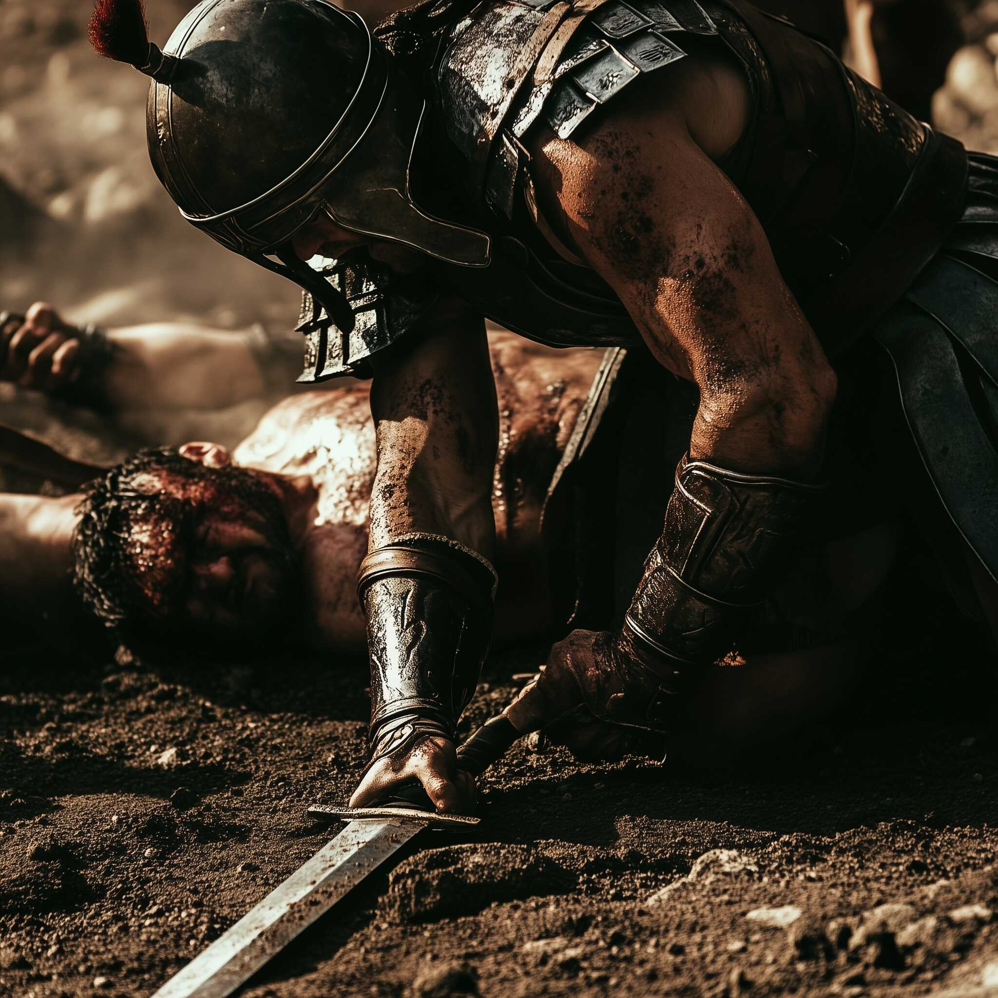 A gladiator laying down his arms, next to his incapacitated opponent. Illustration: Midjourney