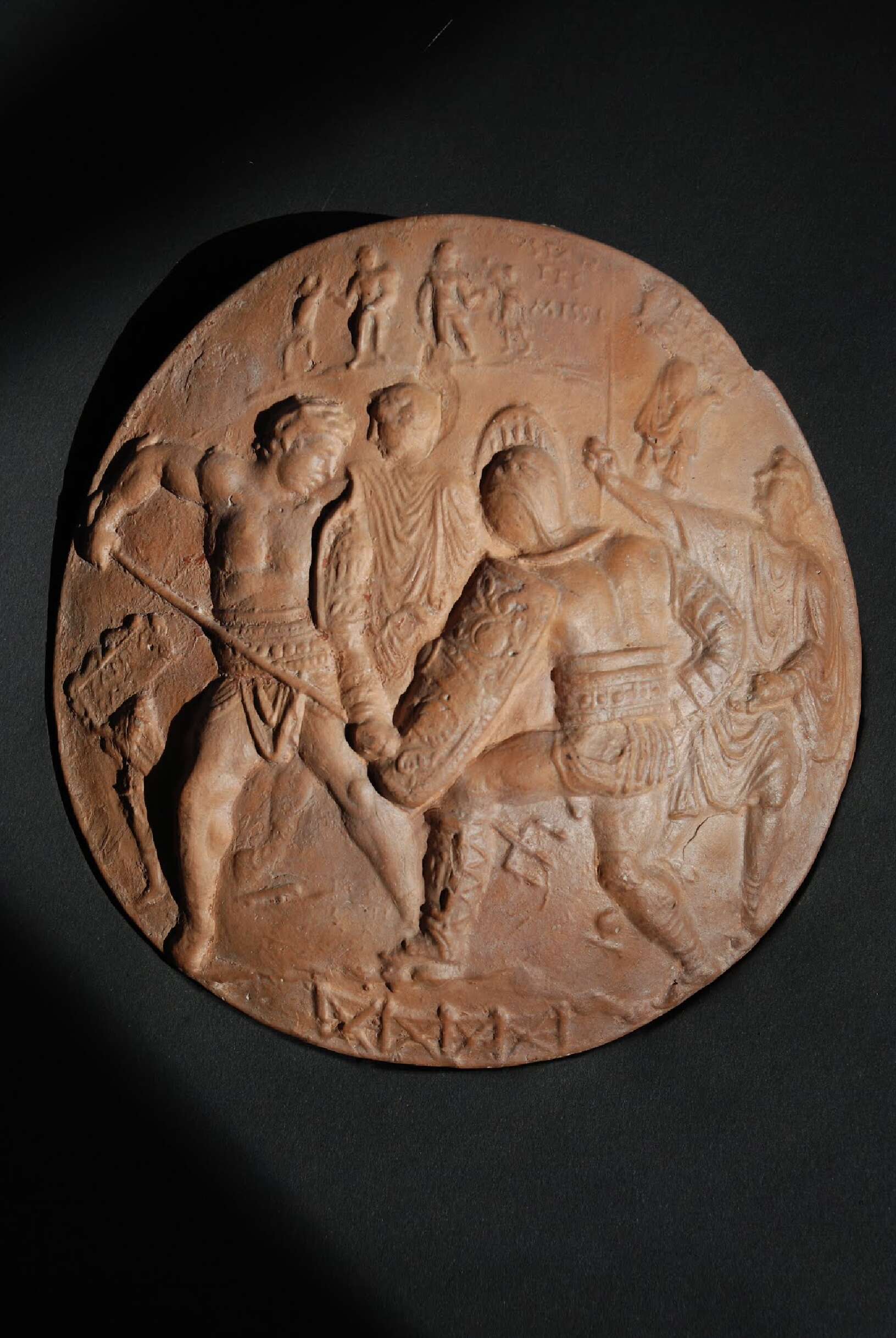 Moreover, at the top of the medallion, the inscription STANTES MISSI ("released standing") indicates missio, or release from the arena, for the two combatants, identified in the background as Xantus, victor in fifteen contests, and Eros, victor in sixteen. The medallion, which depicts a contest between a retiarius and a secutor, dates to the late second or early third century AD and is housed in the Musée Archéologique (Nîmes).