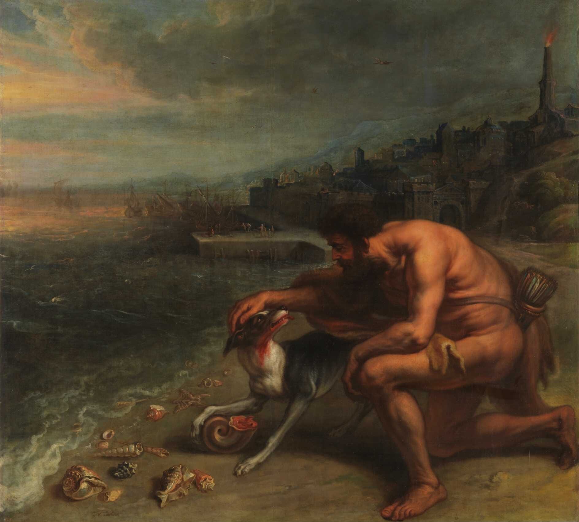 A painting by Theodoor van Thulden, depicting the myth behind the Discovery of Purple by Hercules and his dog. Public domain
