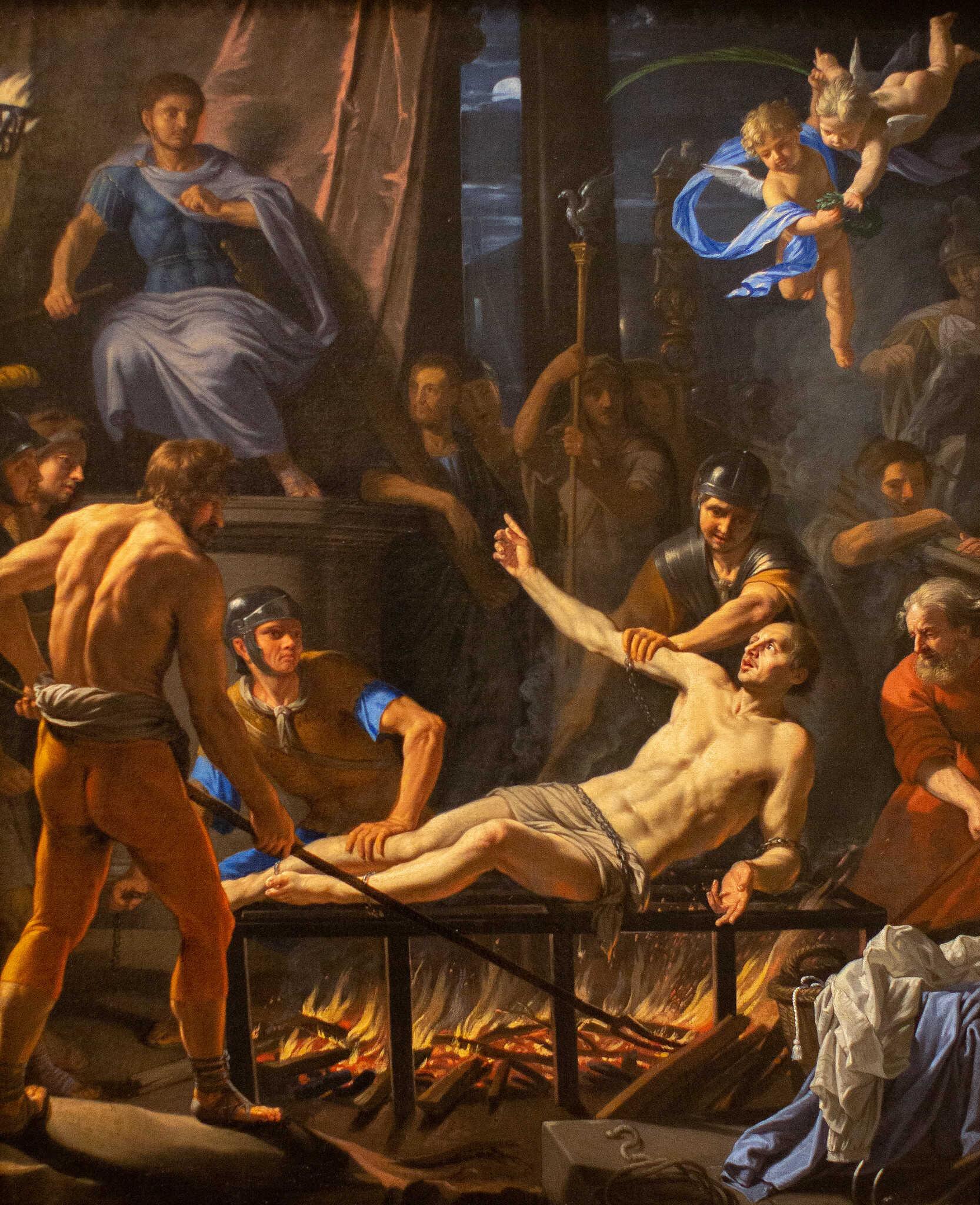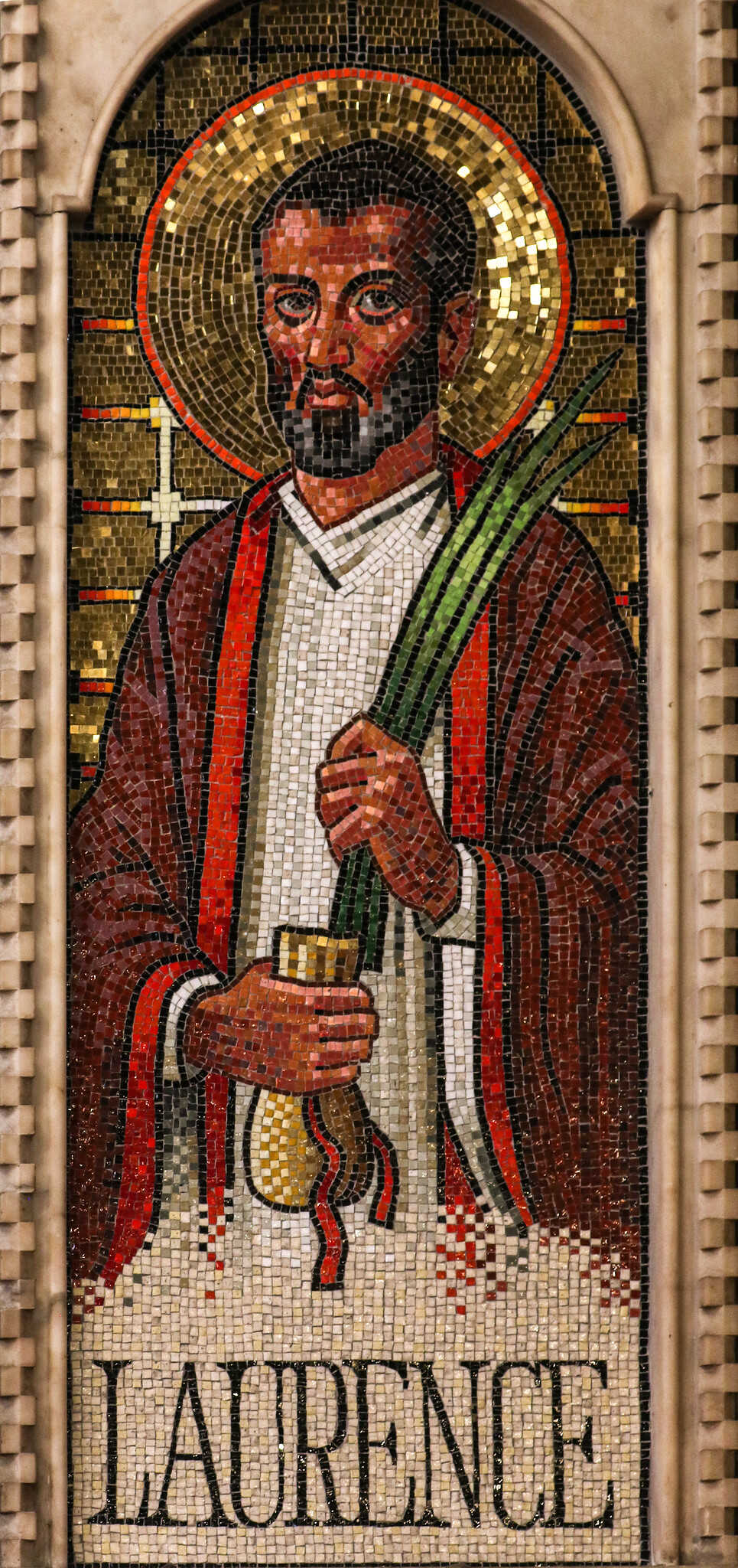 Image #1: A fresco depicting Saint Lawrence, in the presence of Emperor Valerian, is being beaten prior to his execution. Credits: Jim Forest, CC BY-NC-ND 2.0. Image #2: Saint Lawrence was arrested under the Emperor Valerian in 258, laid upon a gridiron and slowly roasted to death, while he rejoiced in his awful martyrdom and died praying for the conversion of the city of Rome. Credits: Thomas Hawk, CC BY-NC 2.0. Image #3: A mosaic of Saint Lawrence by Tessa Hunkin inside Westminster Cathedral, he holds the martyr's palm, and the purse which he was entrusted with as the almoner of the Roman Church, in the background is the gridiron on which he was executed. Credits: Lawrence OP, CC BY-NC-ND 2.0