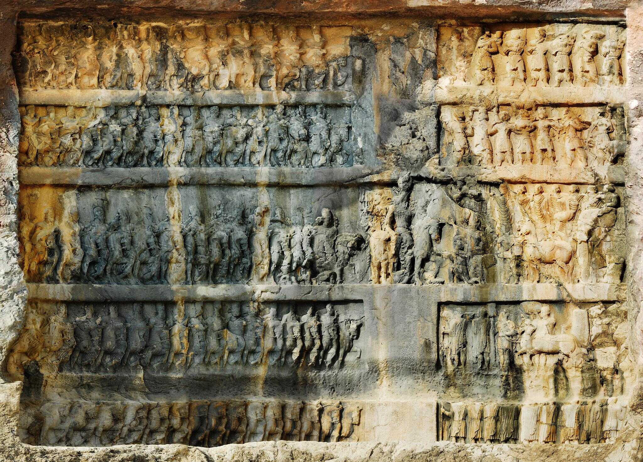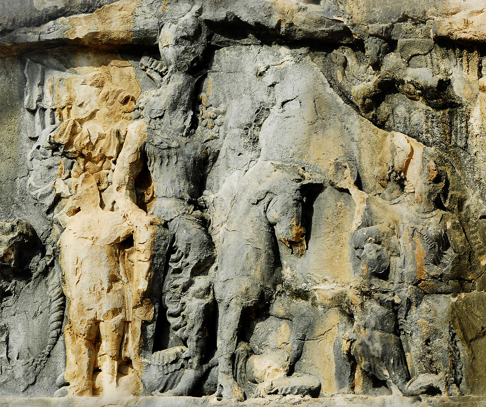 Image #1: Bas-relief from the 2nd century AD in the Tang-e Chowgan gorge by Bishapur, damaged by water flowing from an aqueduct. Image #2: Detail from the carving, where Valerian as a slave in Bishapur, depicted here as aiding Shapur onto his horse. Credits: youngrobv, CC BY-NC 2.0