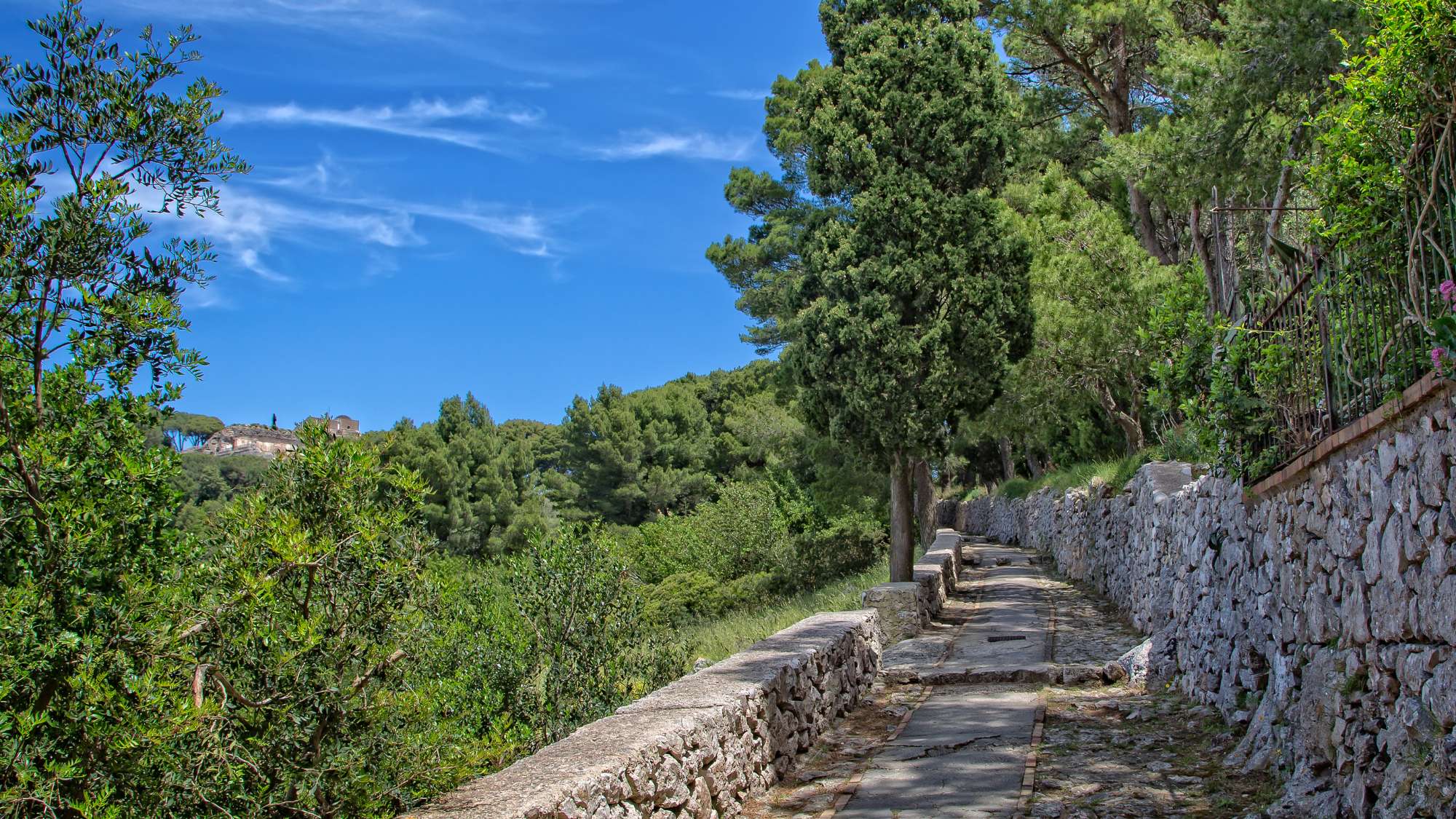 The path to Villa Jovis winds through the narrow streets of Capri village, then continues along a paved lane and shallow steps that lead upward toward the palace entrance. The route, passes through vineyards and fig orchards. Near the entrance, there is a steep drop from the limestone cliffs down to the water, nearly 330 meters (a thousand feet) below.