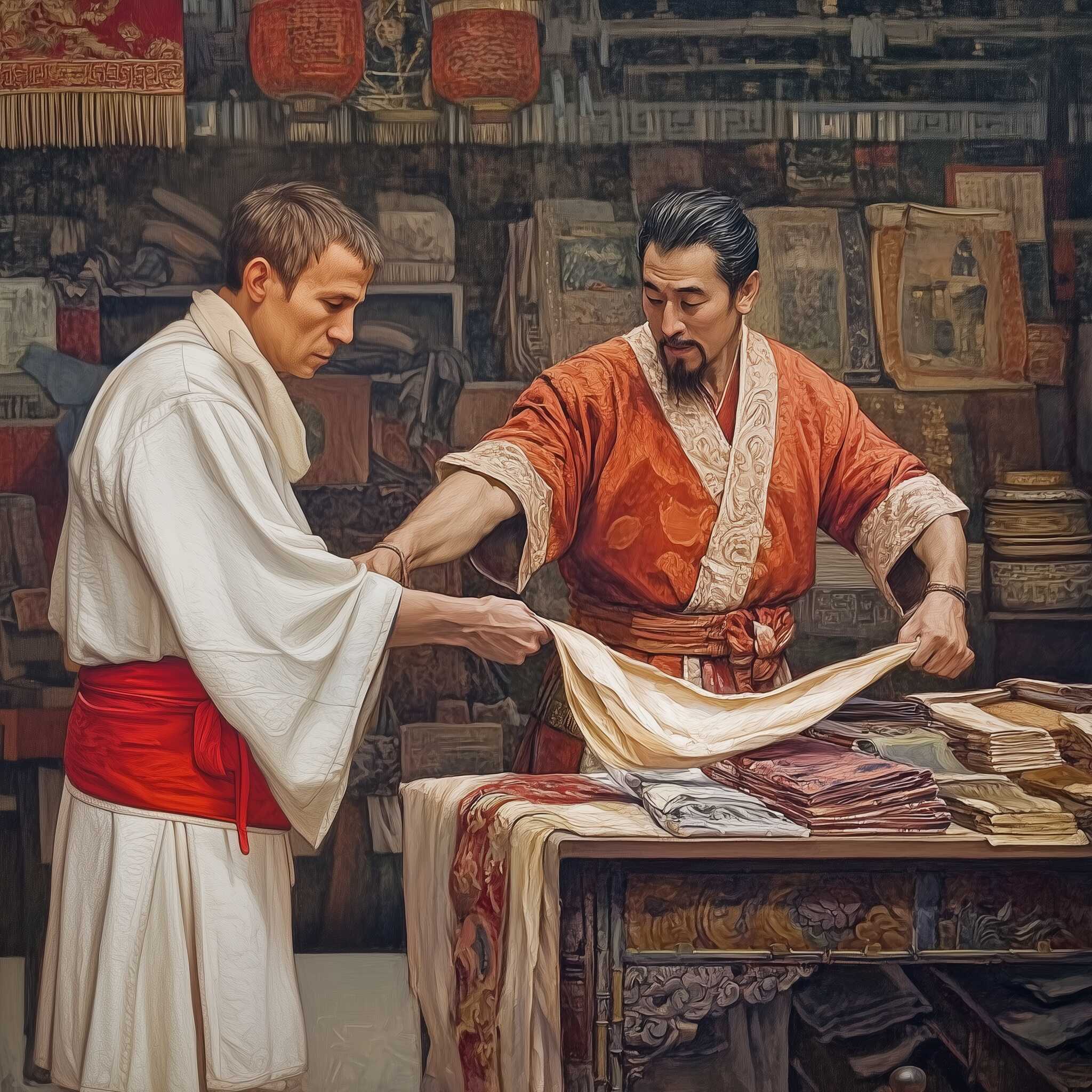 A silk trader in China, selling his merchandise to an ancient Roman merchant. Illustration: Midjourney