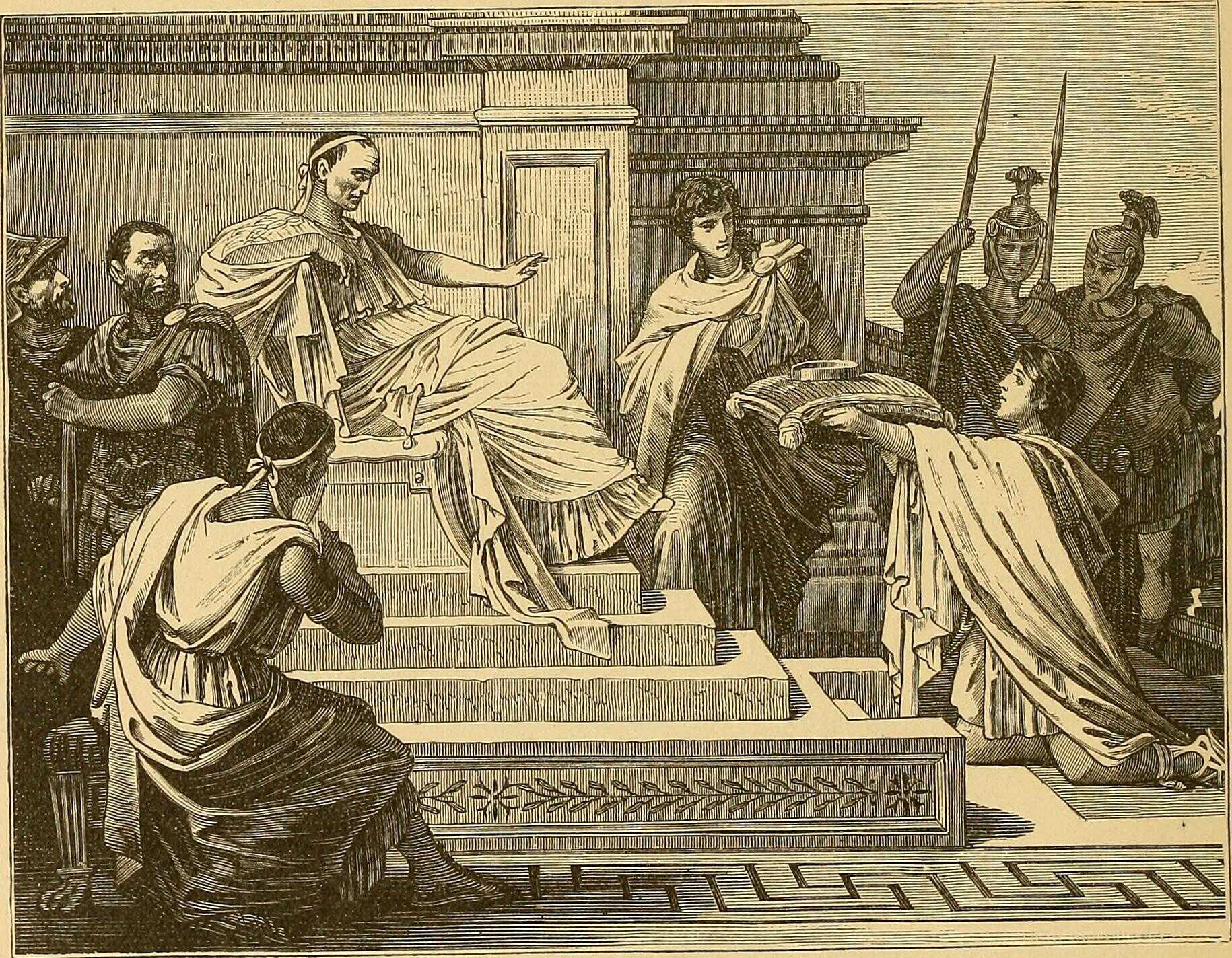 A gravure depicting Julius Caesar refusing the diadem crown offered to him by Mark Antony, as a sign of his status as king. Public domain