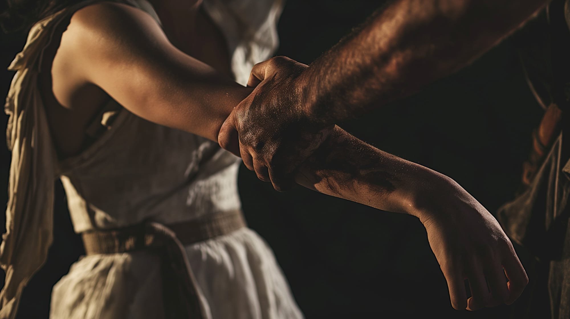 Closeup photo of a Sabine woman being violently abducted, during the event. Illustration: Midjourney
